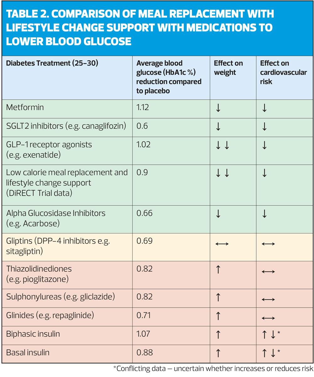 It is useful to compare the impact of lifestyle interventions with the effects of the medications we currently use to lower blood -- levels. This intensive support can achieve a greater blood glucose reduction and weight loss than most of our currently used medications (see Table 2). Some of these medications may even increase cardiovascular risk and weight. These are critical issues for people with type 2 diabetes whose lives are most often shortened by heart attacks and strokes and whose health is impacted by weight. Many of these medications also involve a significant treatment burden, for example, insulin requiring injections, the risk of hypoglycaemia and the need for frequent monitoring using a finger-prick test. It is therefore essential that patients should be informed at every opportunity of all their treatment options, including intensive lifestyle change, as well as medications.