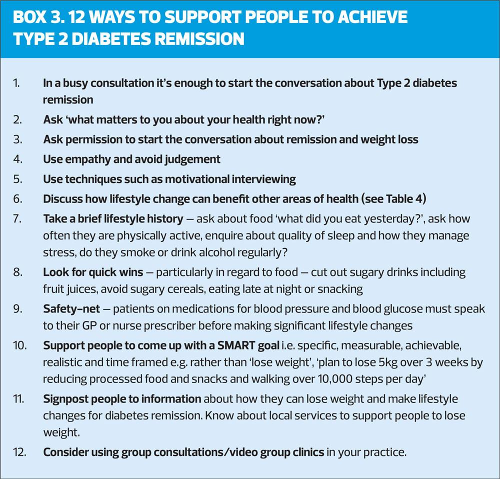 Remission usually occurs following significant weight loss. Weight loss can be achieved by helping patients to change what they eat, how much and how often they eat, how active they are, how much sleep they get and how they manage stress. Practice nurses are ideally placed to support people with these lifestyle changes as they often have trusted and long-term relationships with patients. These relationships help particularly when combined with proven techniques to support people to achieve sustainable lifestyle changes and encourage engagement in programmes that offer more intensive support. Many of the research interventions achieving successful remission have been delivered in primary care by general practice nurses.