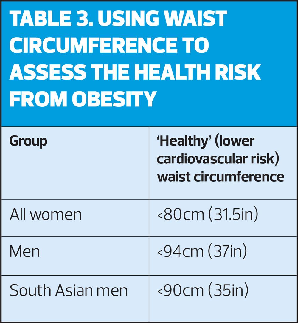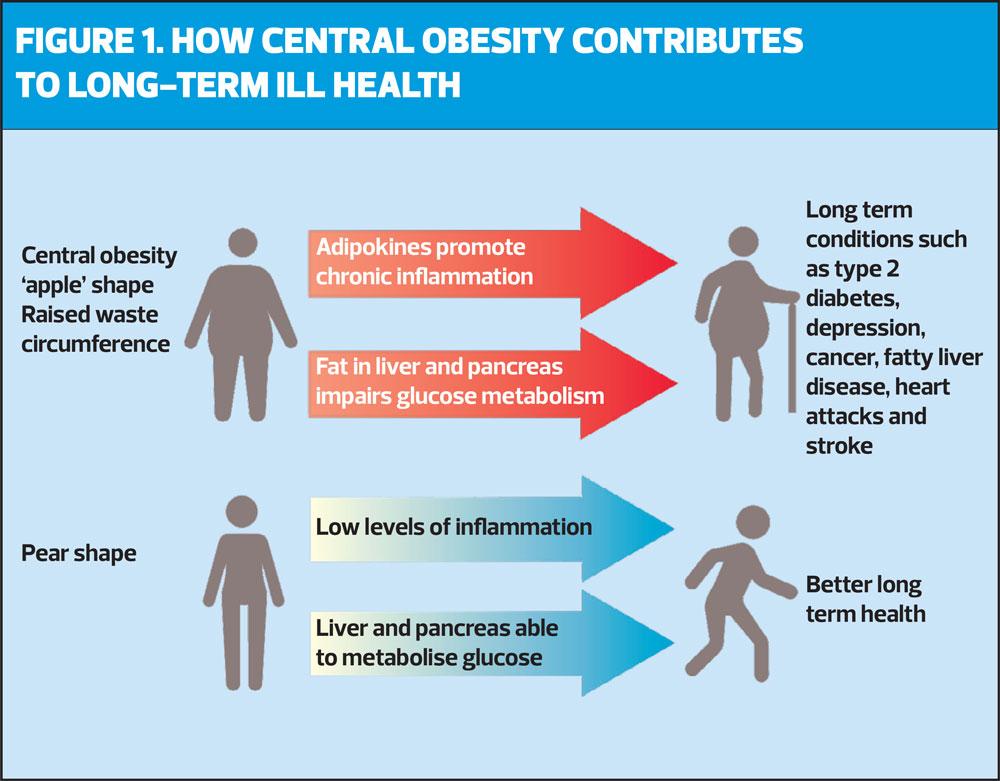 As a result of the DiRECT trial, lead researcher Professor Roy Taylor published a book for patients that describes Type 2 diabetes as ‘chronic food poisoning’12 and, following the trial’s publication, there are calls for a shift in our approach away from simpy managing the condition to treating one of its root causes: food.13 Excess weight, specifically central obesity, drives type 2 diabetes. Central obesity is particularly risky for health as fat stored around the middle of our bodies and in our abdominal organs (particularly in the liver and pancreas) is not inert but produces harmful substances. These substances (known as adipokines) act on the cells of the immune system to cause chronic inflammation which raises the risk of diabetes, heart attacks and strokes, as well as many other long-term conditions including depression and cancer.14 Fat stored in an ‘apple’ rather than a ‘pear’ body shape is therefore a key driver of ill health (Figure 1). Waist circumference can be a useful indicator for central obesity and health risk, and can be used in our patient reviews in addition to BMI (Box 3).