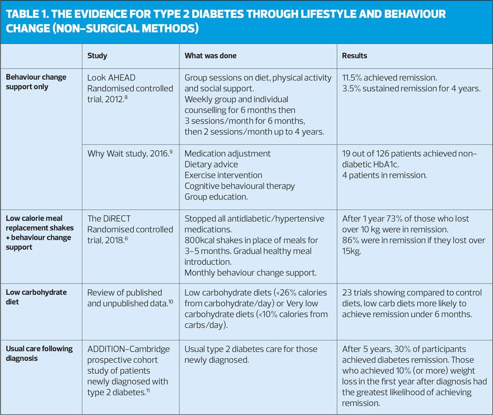 Management of type 2 diabetes traditionally involved simple lifestyle advice to lose weight and move more, followed by a step-wise increase in medications to reduce blood glucose ultimately often resulting in insulin treatment around 8-10 years after diagnosis.4 This approach has been challenged by studies that use a variety of more intensive and comprehensive behaviour interventions to support weight loss and lifestyle change not just to prevent type 2 diabetes but to treat and put it into remission (see Table 1). Similar interventions have already been shown to successfully prevent type 2 diabetes and have been rolled out widely as the NHS Diabetes Prevention Programme.5
