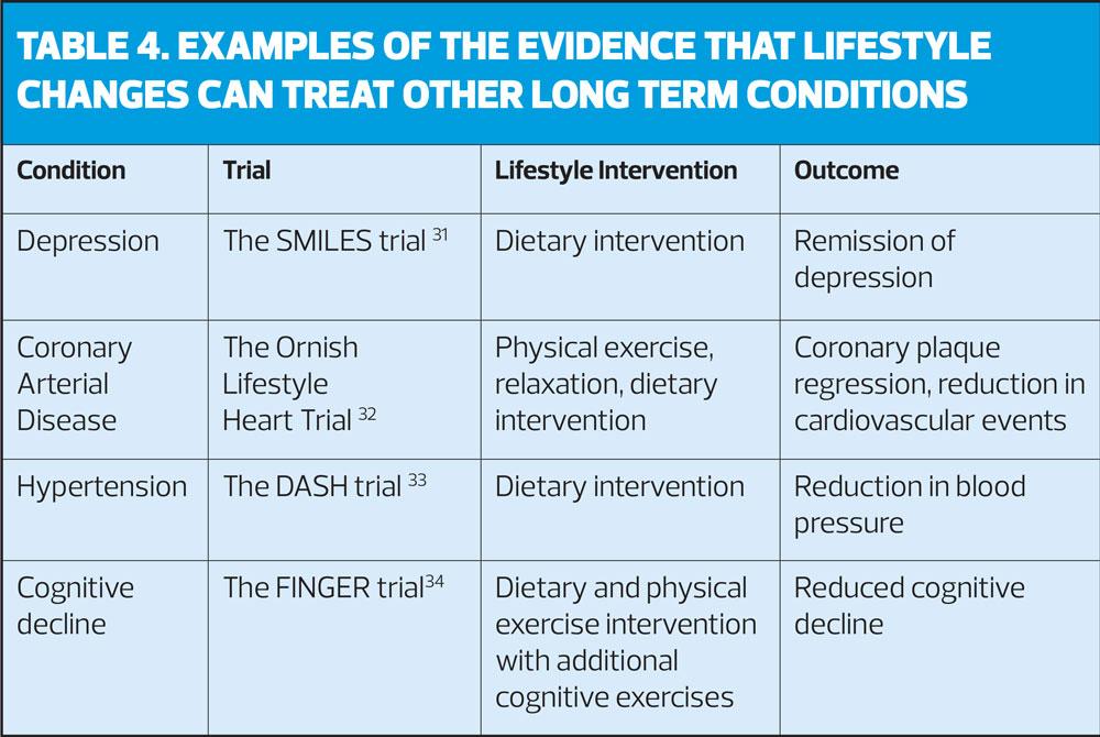 After understanding more about our patient’s health agenda and having raised the topic of remission and weight, we could discuss how changes in lifestyle including physical activity, sleep, stress management and healthier eating can improve and potentially put type 2 diabetes into remission. Most patients with type 2 diabetes have multiple other long-term conditions, and evidence shows that lifestyle changes are not just for prevention but can treat and reverse other conditions too (see Table 4). Discussing how lifestyle changes could impact other areas of people’s lives may provide additional motivation.