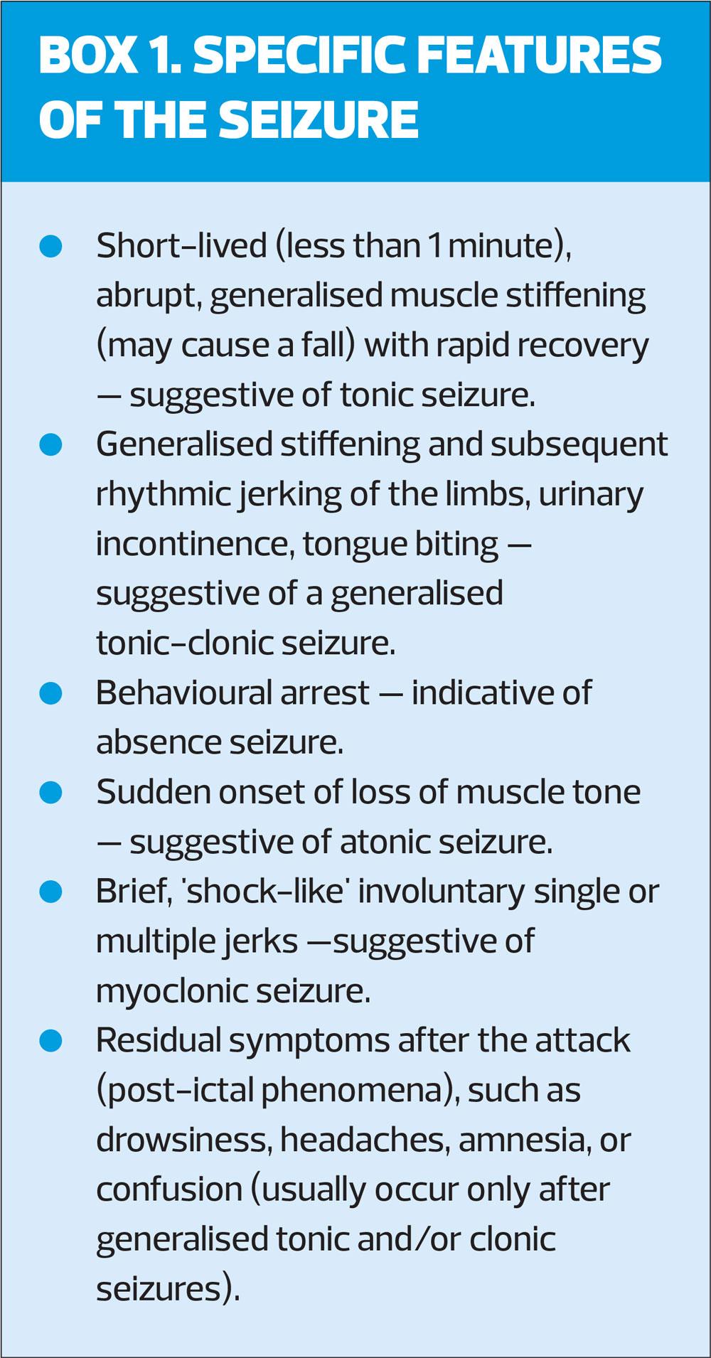 This should include any subjective symptoms at the start of the seizure (aura) – suggestive of focal epilepsy, and any potential triggers, for example sleep deprivation, stress, light sensitivity, or alcohol use. GPNs should also enquire about specific features of the seizure (Box 1).