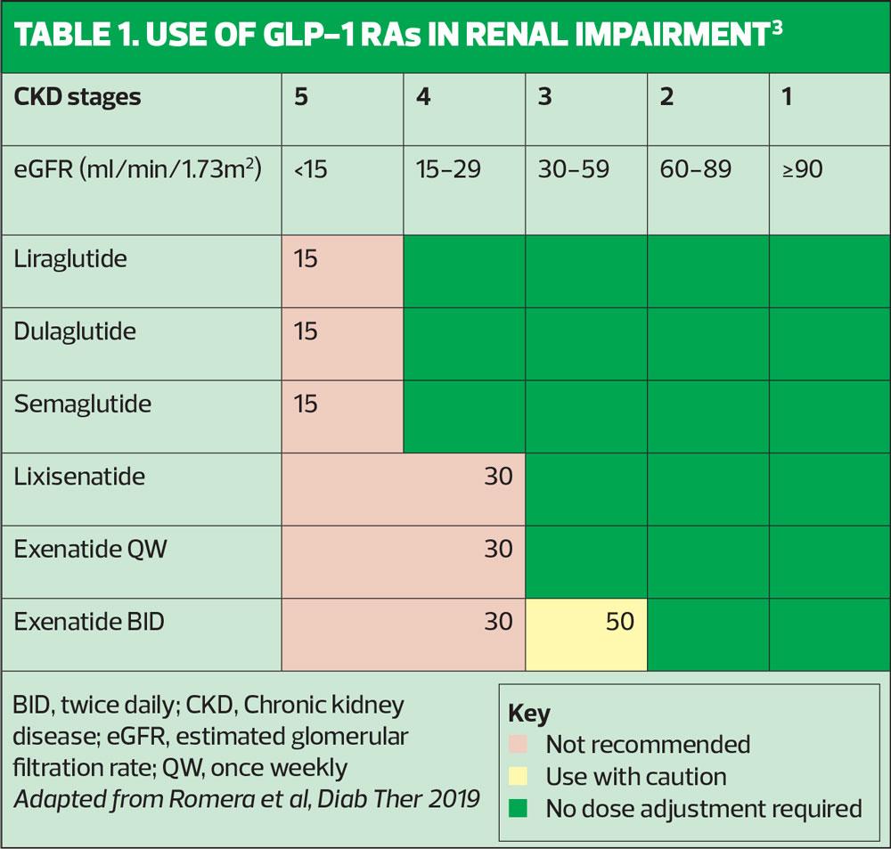 - Renal impairment: With the exception of exenatide, all GLP-1 RAs can be used without dose adjustment in in patients with mild or moderate renal impairment (Table 1).3