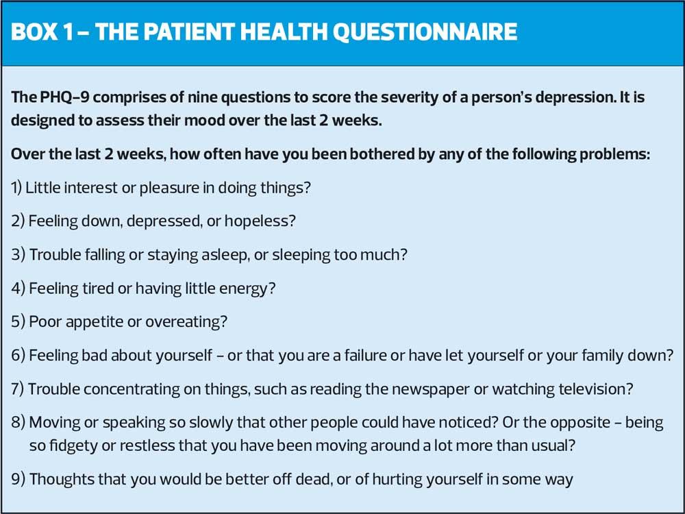 An answer of ‘No’ to the questions indicates that the person is unlikely to have depression, but they should be given the option of coming back to see a healthcare professional should they change their mind. An answer of ‘Yes’ should prompt a more detailed assessment, using the Patient Health Questionnaire (PHQ-9) (Box 1). If a person attends and volunteers that they are feeling down or depressed, they can be assessed with the PHQ-9 and there is no need to use the screening questions.