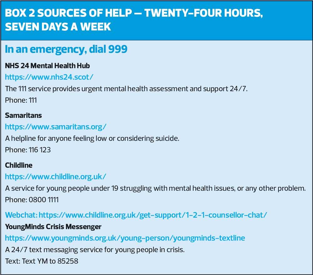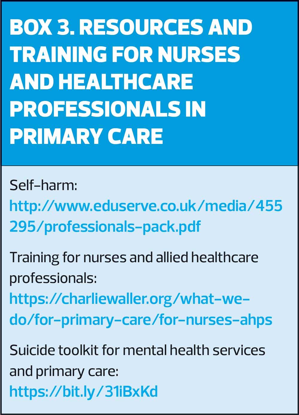 Practice nurses and primary healthcare professional should make themselves aware of national and local services for people who may be at risk of suicide and promote these to patients when appropriate. National online support includes:
