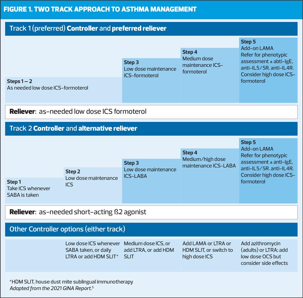 With Track 1, when a patient at any treatment step has asthma symptoms, they use low dose ICS-formoterol (in a combination inhaler) for symptom relief. In steps 3-5, patients also take ICS-formoterol as their daily controller treatment (maintenance and reliever therapy [MART]). Note that ICS-formoterol should not be used as the reliever in patients prescribed a different ICS-LABA for their controller therapy.