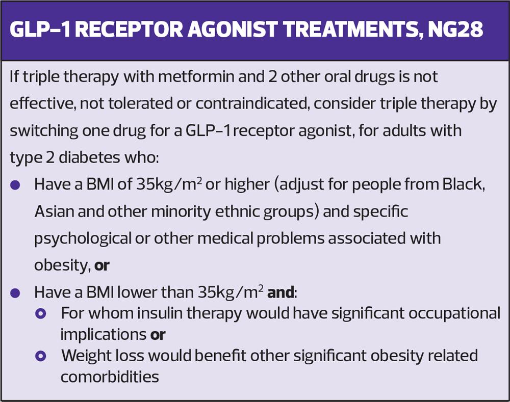 If this triple therapy with metformin and two other oral drugs is not effective, not tolerated or contraindicated, then the advice is to consider a different triple therapy by switching one drug for a GLP"‘1 receptor agonist (RA) in people who either have a BMI of 35 kg/m2 or higher and specific psychological or other medical problems associated with obesity or have a BMI lower than 35 kg/m2 and for whom insulin therapy would have significant occupational implications or weight loss would benefit other significant obesity-related comorbidities.