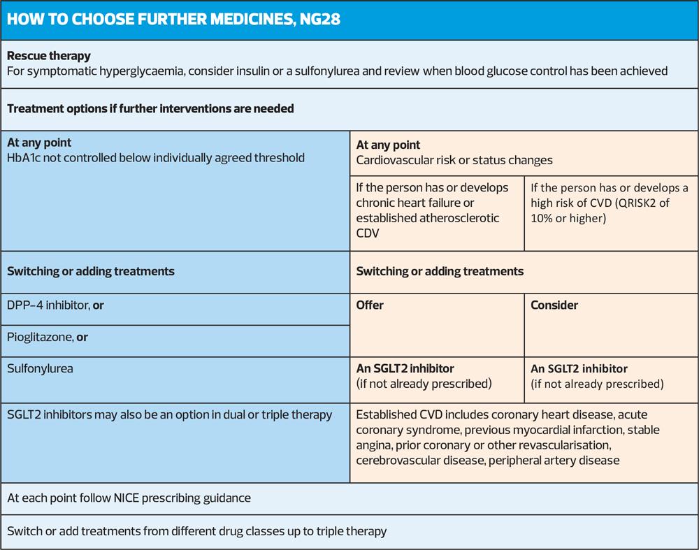 The NICE guideline committee (GDC) advises that you should consider adding an SGLT2 inhibitor to the current treatment or, instead, replace an existing drug with an SGLT2 inhibitor.