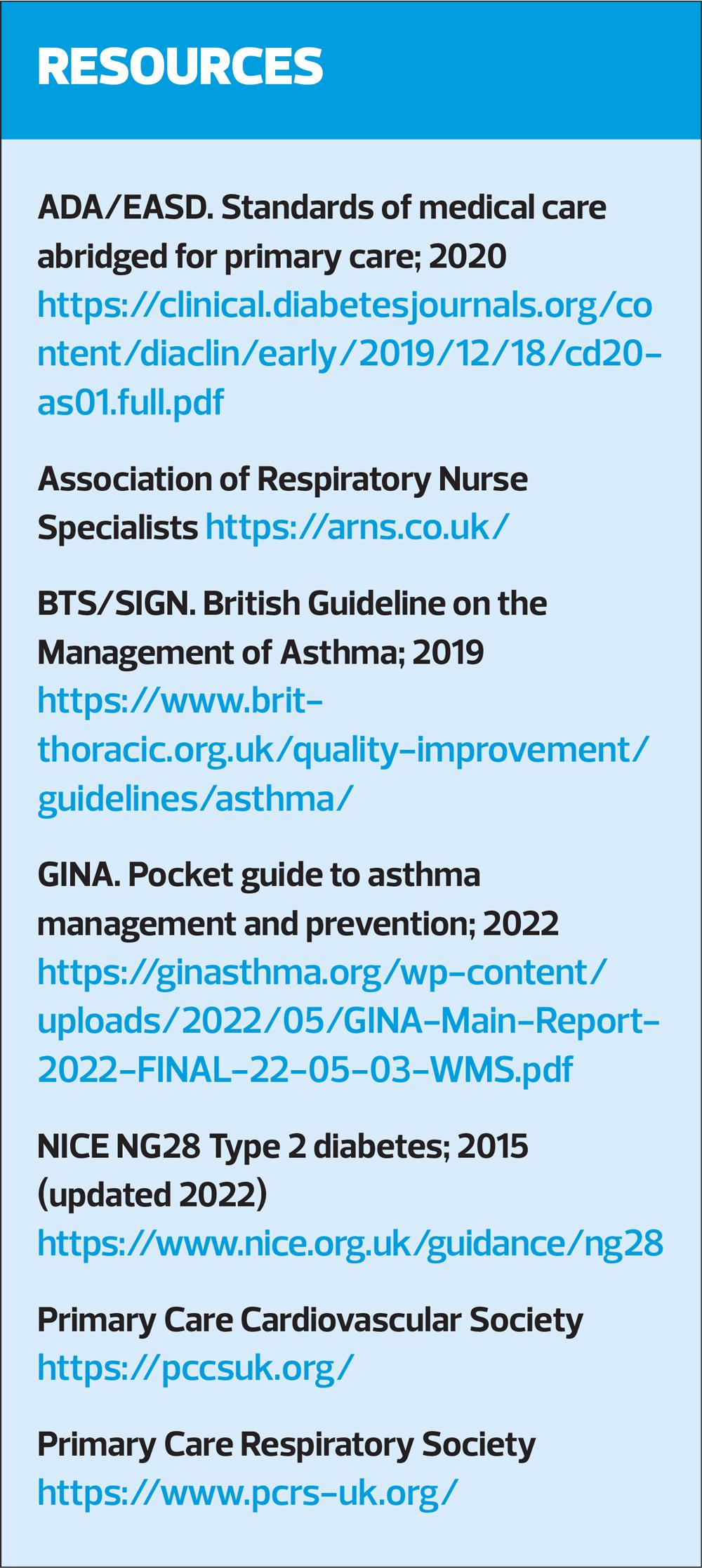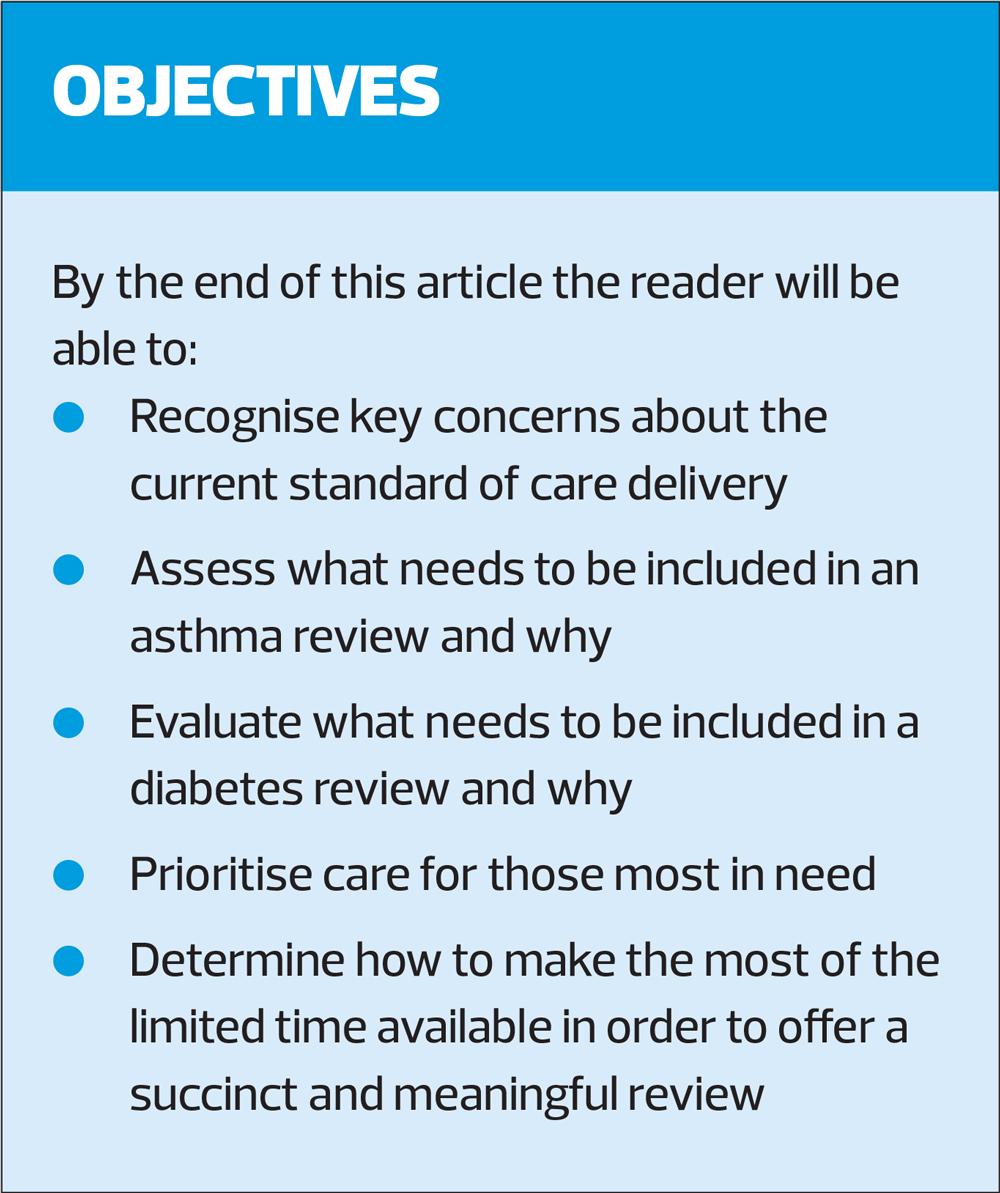 This article aims to identify the important findings from the Asthma+Lung UK and DUK surveys and offers an opportunity to consider how general practice nurses (GPNs) can ensure the delivery of a high standard of holistic, evidence-based care to improve a broad range of patient outcomes including optimising quality of life and minimising the risk of complications or exacerbations. In view of these reports, the article focuses on getting back to basics with asthma and diabetes reviews and identifies what should be included in the review.
