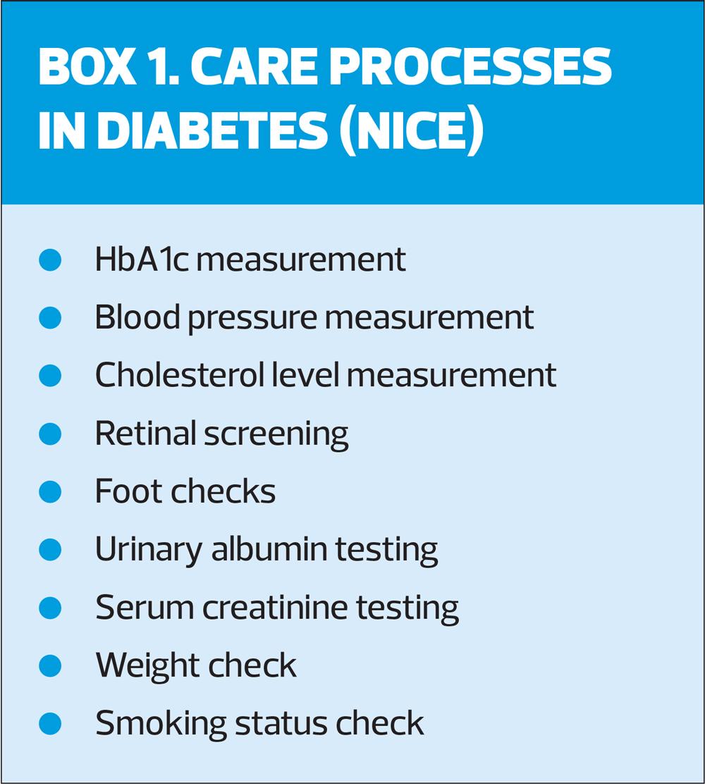 The DUK report which gathered information from 10,000 people, out of the 4.9 million people living with diabetes in the United Kingdom.2 Of those who took part in the survey, 47% reported difficulties managing their condition during 2021, with 63% linking those difficulties at least in part to not having sufficient access to their health care team. Worryingly, this figure rose to 71% in deprived areas, correlating with a reported lack of basic diabetes health checks. This lack of basic care was reportedly higher in deprived areas than in less deprived areas. Shockingly, one in six survey respondents stated that they had had no contact with their diabetes healthcare professionals since before the pandemic. It is essential that people living with diabetes have access to an adequate standard of care because of the high risk (and cost) of complications if the condition is not managed correctly and proactively. Every week, diabetes leads to more than 190 amputations, 770 strokes, 590 heart attacks and more than 2,300 cases of heart failure. Around 10% of the NHS budget is taken up on diabetes care, but 80% of that goes on treating the complications of diabetes. Complication risk is reduced by implementing the NICE care processes (Box 1), and addressing the ABC targets – A1c, blood pressure and cholesterol.