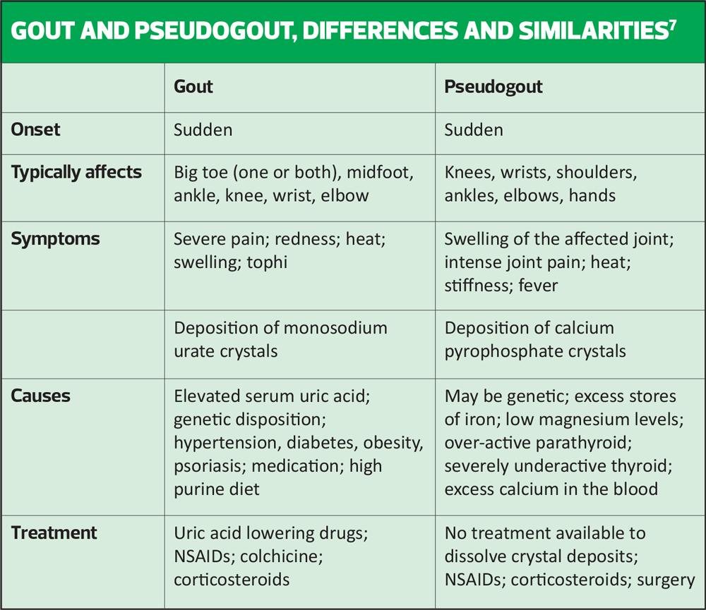 However, if someone presents with a painful, red, swollen joint, it is important to consider other diagnoses, such as inflammatory arthritis, calcium pyrophosphate deposition (pseudogout - see Table overleaf), or septic arthritis.3 Septic arthritis is caused by infection in the joint, and while symptoms may resemble those of other arthropathies, it is usually accompanied by fever. It is a medical emergency and requires immediate specialist referral to avoid permanent joint damage.
