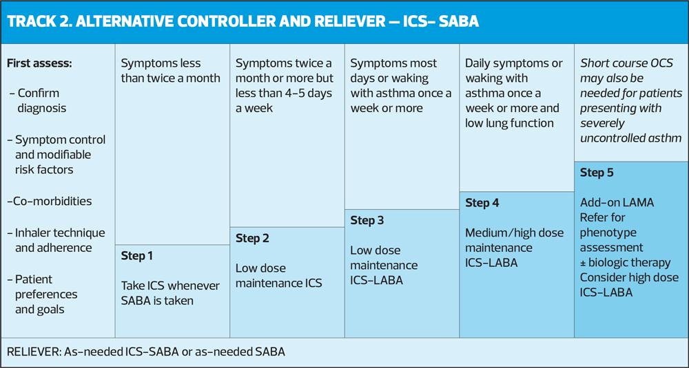 In Track 2, the reliever is as-needed SABA or ICS-SABA, but before prescribing a regimen with SABA as the reliever, consider whether (or not) the patient is likely to adhere to the ICS-containing inhaler, as otherwise they will be exposed to the risks of SABA-only treatment.