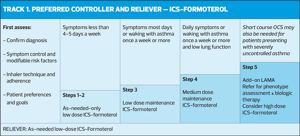 At any step under Track 1 recommendations, when a patient has asthma symptoms, they should use low-dose ICS-formoterol. In Steps 3 – 5, patients also take combination ICS-formoterol as their daily maintenance treatment (MART).