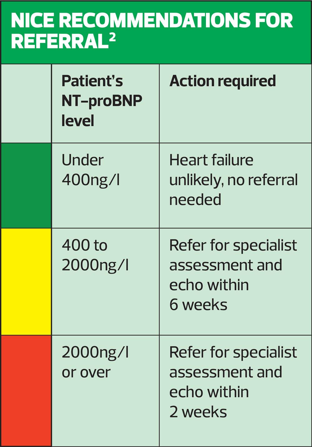 - The latest update to the NICE quality standard states categorically that adults presenting in primary care with suspected heart failure should have their NT-proBNP measured3