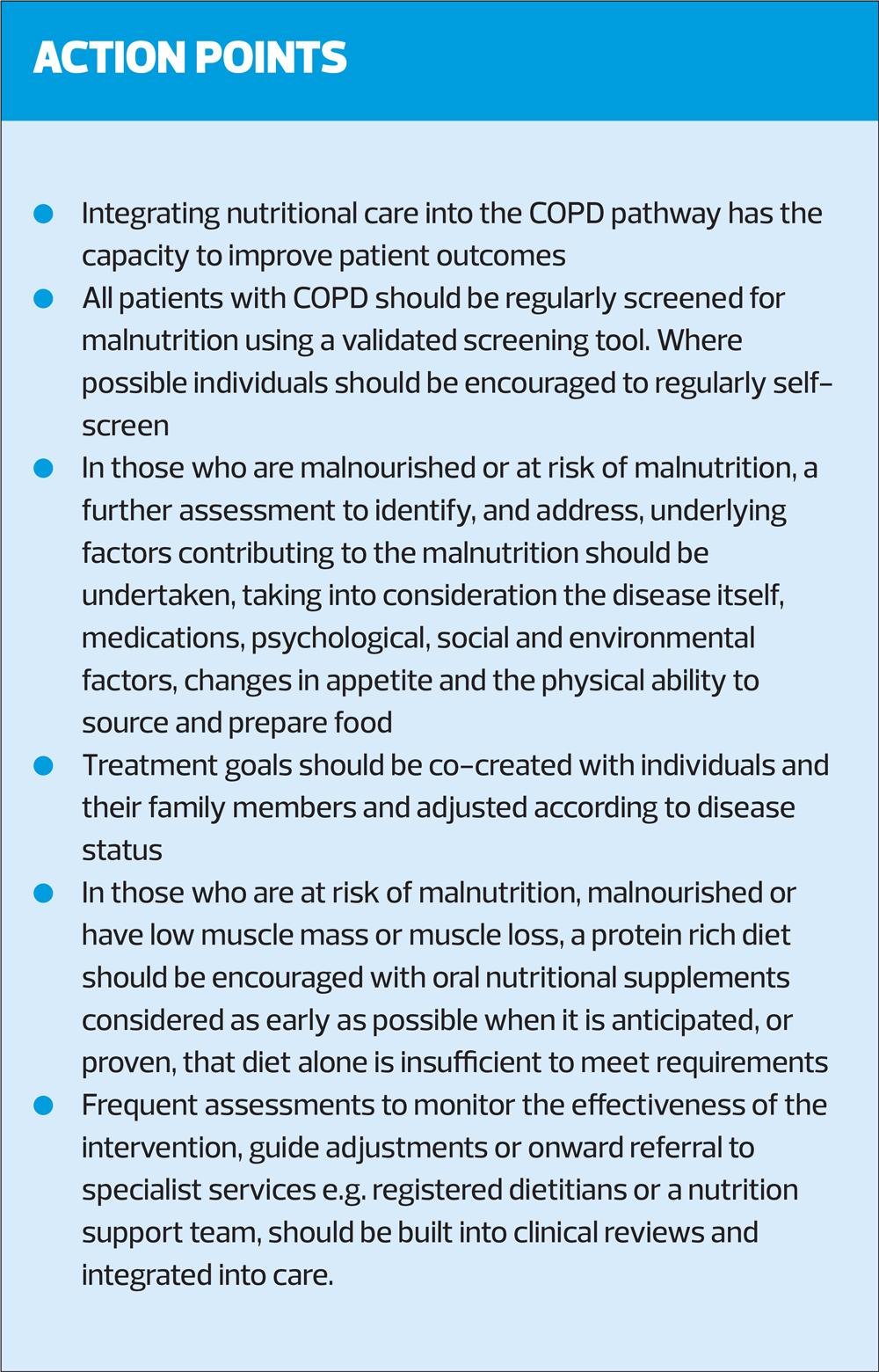Poor nutritional intake in individuals with COPD is common. Causes of poor intake and malnutrition in individuals with COPD are varied and include the physiological effects of the disease, psychological, social and environmental factors. To optimise metabolic health, prevent malnutrition and improve outcomes, dietary advice should be an integral part of COPD management across the continuum of care. Practice nurses can play a key role in ensuring that patients are nutritionally screened and assessed to identify nutritional issues. If confident and competent to do so, nurses can offer first-line dietary advice and oral nutrition support using evidence-based resources available and refer those at high risk of malnutrition, or those with more complex nutritional needs, to the appropriate professional, i.e. dietitian, for further intervention. Timely nutritional interventions can have positive effects on overall patient care and bring benefits to the individual’s quality of life.