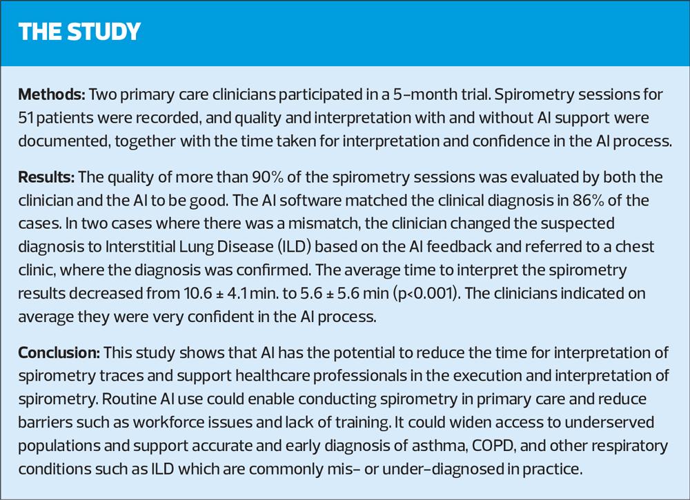 The AI software matched clinicians’ spirometry quality evaluation and clinical diagnosis in the majority of the cases. Clinicians reported high levels of confidence in the AI process and a reduction in time to interpretation by almost 50%. Routine AI use could enable conducting spirometry in primary care and reduce barriers such as workforce issues and lack of training. It could widen access to underserved populations and support accurate and early diagnosis of asthma, COPD, and other respiratory conditions such as ILD which are commonly mis- or under-diagnosed in practice.
