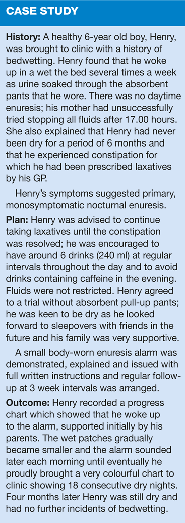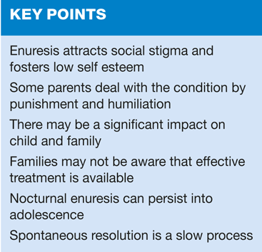 Bedwetting is a distressing condition both for children, especially if it persists into early school years, and for parents. Although many children will eventually 'grow out of it' practice nurses can offer practical help