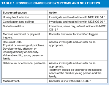 Low bladder capacity: reduced functional bladder capacity (the volume at which the bladder empties itself) can be a contributing factor in NE. The child or young person may need to void two or three times during the night, before the bladder is actually full; this is often accompanied by daytime symptoms of urinary urgency, frequency and incontinence.