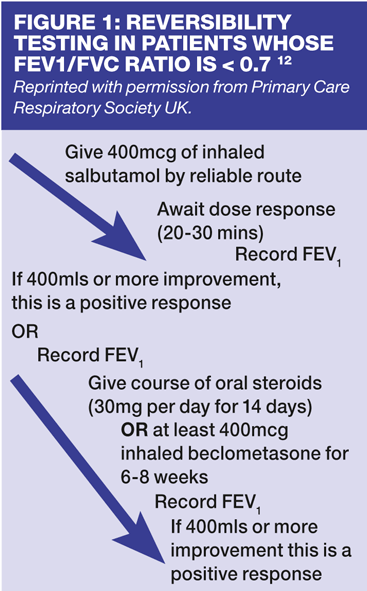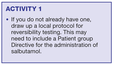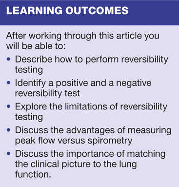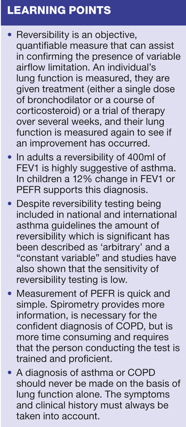 Asthma is common, but its diagnosis can be difficult, time consuming and relies heavily on clinical skills and examination. Lung function tests are very useful in identifying airflow obstruction and the identification of reversibility of airflow obstruction has become a recognised way of diagnosing asthma and ruling out chronic obstructive pulmonary disease (COPD). Reversibility testing is relatively simple and cost effective, and can be undertaken in a primary care setting.1 What constitutes reversibility of airflow obstruction is defined within national2,3 and international guidelines,4 and testing for reversibility is encompassed within the Quality Outcomes Framework (QOF) for asthma.5