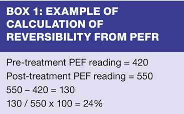 The second measurement is taken after approximately 20 minutes. The degree of reversibility is calculated by subtracting the pre-treatment reading from the post-treatment reading, and then expressing this is a percentage of the highest reading. Box 1 gives an example of this for PEFR.