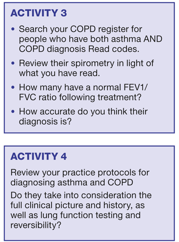 Asthma and COPD are regarded as separate diseases, yet they have physiological and pathological similarities.6 This can lead to difficulties in diagnosis and the choice of treatment strategies.7 While there are similarities in the treatment of people with asthma and COPD, there are some fundamental differences, particularly in the use of inhaled steroids. This makes accurate diagnosis essential if safe and effective treatment is to be prescribed.