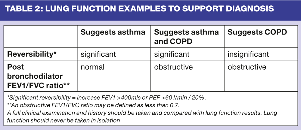 Quality assured spirometry with reversibility testing may help to elicit the degree of airflow limitation, and the amount of reversibility. If the FEV1/FVC ratio does not return to normal following a reversibility test (bronchodilator or corticosteroid) or a trial of treatment, then predominantly fixed airways disease, such as COPD, may be considered. If the ratio does not return to normal and the patient demonstrates a positive reversibility of more than 400mls, then a dual diagnosis of asthma and COPD may be suspected (Table 2). Any diagnostic uncertainty should lead to consideration of a referral for specialist advice and further testing, in order to avoid inappropriate treatments being started.