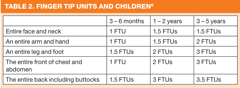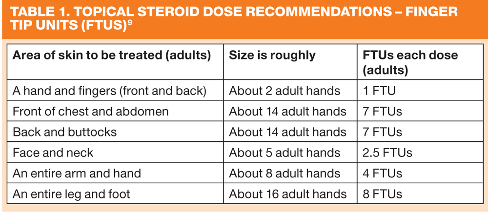 Topical steroids should be applied thinly, and only to inflamed skin.2 The unit of measurement is the finger tip unit, i.e. the amount of topical steroid that can be squeezed out of a standard tube with a 5mm nozzle along an adult's fingertip, from the end of the finger to the first crease.9 (See Tables 1 & 2) If it seems that patients are using too much, or there are signs of atrophy, it may be time to consider treatment with a topical immunomodulator, tacrolimus or pimecrolimus,2 both of which are recommended by NICE for adults and children aged 2 years and over as a second-line treatment.10