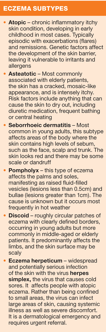 Eczema can be a debilitating, miserable condition, but with careful management it does not have to be. There is much that practice nurses can do to ensure that patients or parents are aware of the importance of effective emollient regimes, which should help to control the inflammation and reduce the need for topical steroid therapy in mild-to-moderate disease.