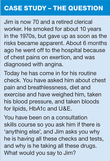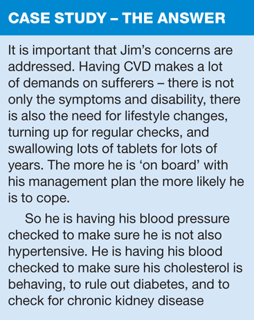 However, this report does point out the interconnectedness of circulatory diseases, emphasising a central feature that they do cluster in some individuals. If you have a patient with one circulatory problem, it is a good idea to look for others. And so your response to Jim must be an honest one — 'because you have angina you are at increased risk of having all manner of other unpleasant diseases, and the risk can be reduced by appropriate management'.