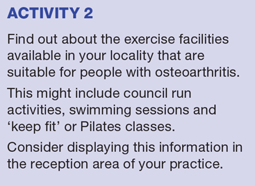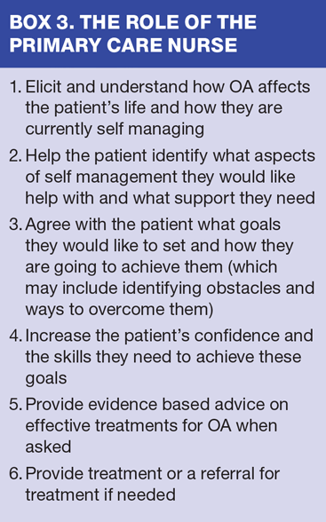 Practice nurses are ideally placed to help people with osteoarthritis engage in the self-management that can reduce its impact