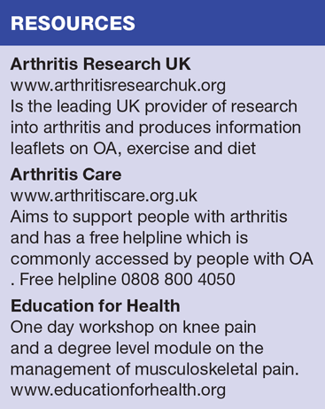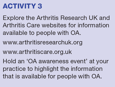 The main myth to dispel is that OA is a progressive wearing out of joints due to old age, which invariably leads to a reduction in activity. Practice nurses can have a key role in explaining what OA is and how patients can play an active role in managing their symptoms. (Box 3). It is important to convey positive and constructive messages about OA and its progression. Many people believe that nothing can be done and that progression is inevitable.