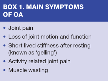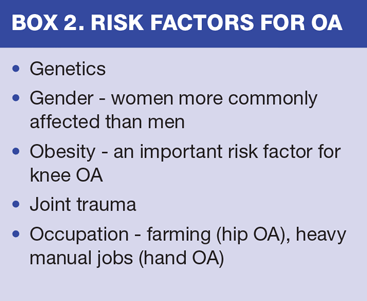 It is often described as ‘wear and tear’ but OA would appear to be a metabolically active process that is characterised by periods of increased symptoms (referred to as a flare) followed by periods where symptoms become less bothersome. It seems that, in some individuals, there can be an element of repair so that minimal or no symptoms are experienced. Other individuals seem to have ongoing symptoms arising from a compromised repair process. Risk factors and the common symptoms of OA are shown in Boxes 1 and 2.