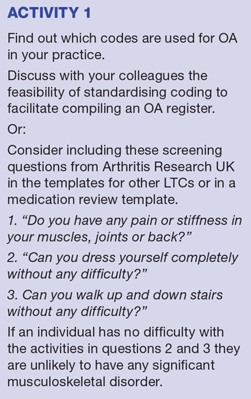 A major barrier to improving care is the lack of inclusion of OA in QOF. We therefore need to look at other opportunities to engage with people with OA without creating new services. Many people with OA also have another long-term condition (LTC), and if they are taking analgesics regularly, they will need to be seen for a medication review. These consultations could provide you with an opportunity to enquire how they coping with their OA and point them in the direction of appropriate support – in the voluntary sector, e.g. Arthritis Research UK or Arthritis Care, if necessary. (See Resources) Arthritis Research UK has developed some quick screening questions that can be used to identify individuals suffering from significant musculoskeletal disease. (See Activity 1)