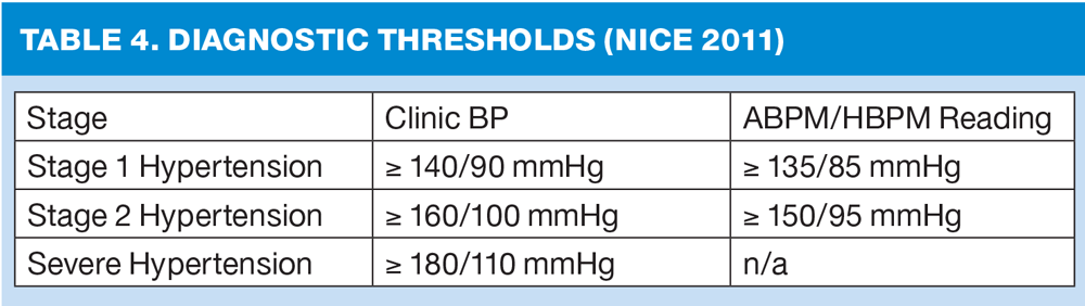 A diagnosis of hypertension should be confirmed or refuted based on the average daytime reading.1 NICE diagnostic thresholds, using clinic and home based readings can be seen in Table 4. Most modern ABPM equipment will allow for the download of readings onto a practice computer and the average daytime reading will be automatically calculated. When using HBPM this can be calculated manually by adding firstly the systolic readings together and dividing by the number of readings taken, followed by the same process for the diastolic readings. The first day’s readings should be discarded to allow for the patients to having to familiarise themselves with the equipment.