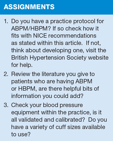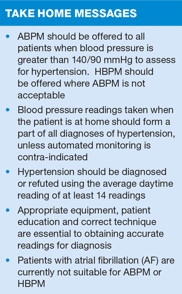 Getting the practicalities of ABPM and HBPM right is essential to ensuring patients with possible hypertension are assessed in an appropriate, effective and timely fashion. Although ABPM is the preferred method in the majority of patients, the key factor is that blood pressure monitoring outside of the clinical setting features in the diagnostic pathway. If ABPM is not acceptable or appropriate for some patients HBPM provides a useful alternative that will fulfill the criteria of readings needed to make a diagnosis. Practice nursing teams are key to this process in primary care and could take the lead on ensuring the process and resources for this service are suitable for their patient population and are in line with relevant national guidance.