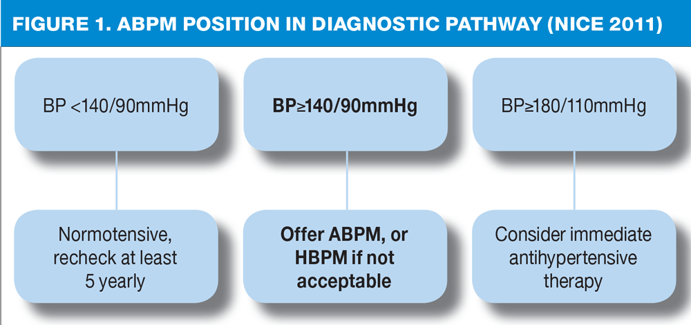 Ambulatory blood pressure monitoring is the most accurate way of diagnosing hypertension in adults.1 The 2011 NICE hypertension guidelines and Quality Standards,2 published in 2013, recommend that people with suspected hypertension are offered ABPM to confirm the diagnosis (Figure 1), and that its use should reduce unnecessary treatment in those who do not have true hypertension. Furthermore ABPM is a better predictor of blood pressure related clinical events than standard clinic monitoring.3