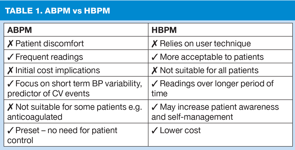 Although there is clearly more evidence for the use of ABPM in diagnosing hypertension the key factor is that there has been adequate assessment of blood pressure outside of the clinical environment to allow diagnosis to take place. This will only be possible with a sufficient number of reliable readings obtained through correct technique with a validated device. A summary of the benefits and limitations of both ABPM and HBPM can be seen in Table 1.