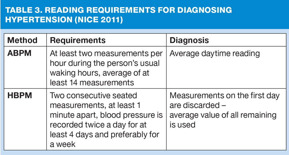 For both ABPM and HBPM readings the clinician needs to take into account that readings should be expected to be lower than average clinic readings, and also that the evidence base for hypertension management is based on measurements obtained in the clinical setting. The most recent NICE guidelines give specific thresholds for ABPM and HBPM readings – unlike previous versions where clinicians were advised to add a nominal measure to home readings for comparison purposes.1