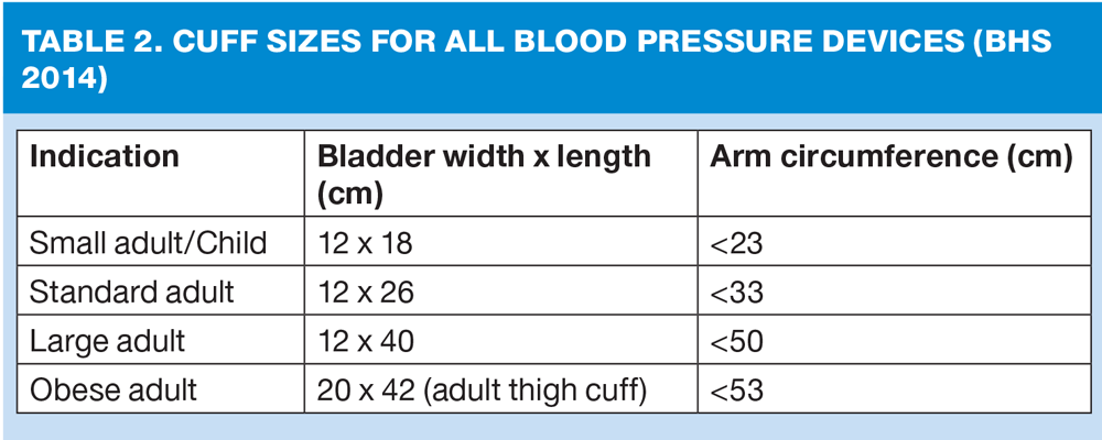 In addition to the device itself the user needs to ensure they are using an appropriate cuff size for the patient, a cuff that is too small or large will lead to over, or under-reading of the blood pressure. Appropriate cuff sizes for all blood pressure measuring devices can be seen in Table 2.
