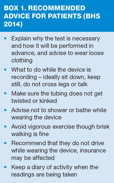 As well as information around the device itself and what the process involves the patient needs to be aware of the importance of using the correct technique to monitor blood pressure (Box 1). Although the patient will be in their own home there still needs to be a standardised procedure to obtaining blood pressure readings, particularly where the patient is in control of their own measurement in HBPM.