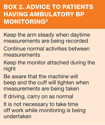 Approximately 30 minutes should be scheduled for the fitting appointment, to allow time adequate explanation and time for questions, before obtaining informed consent and fitting. Before the monitor is fitted, measure BP manually in both arms: if the systolic measurement is greater than 10mmHg in one arm, the arm with the higher pressure should be used.16 Ensure that an appropriate cuff size is selected because a cuff which is one size too large will underestimate systolic and diastolic BP readings by 3-5 mmHg in men and 1-3mmHg in women, and overestimate by 2-6mmHg in men and 3-4mmHg in women when the cuff is one size too small.16 The meter is then fitted to the patient. The digital machine takes blood pressure readings by inflating the cuff around the upper arm in the same way a meter records blood pressure in surgery. The recording device is attached to a belt or waistband. Both remain in place for the full 24 hours. The machine then takes blood pressure readings at regular intervals throughout the day (and night), usually every 20—30 minutes, although it can usually be set to record at different time intervals if required.17 During waking hours, the patient should continue their normal daily activities. At night the meter can be placed close by, either on the bedclothes or on the pillow. After 24 hours the patient returns, and both cuff and meter are removed. The meter is then connected to the computer and a report is generated. The way in which readings are displayed varies according to the type of machine being used and may be shown numerically or as a graph or both. Measurements for systolic and diastolic blood pressures are shown for the times they have been recorded with mean values.