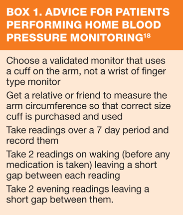 When HBPM is the preferred method readings should be taken twice daily (preferably morning and evening) for at least seven days. For each reading, two consecutive measurements should be taken at least one minute apart with the person seated.6 The measurements from the first day should be discarded before the average value of the readings is calculated to confirm a diagnosis of hypertension. Guidance for patients who are asked to use this method or who choose to do so, is shown in box 1.