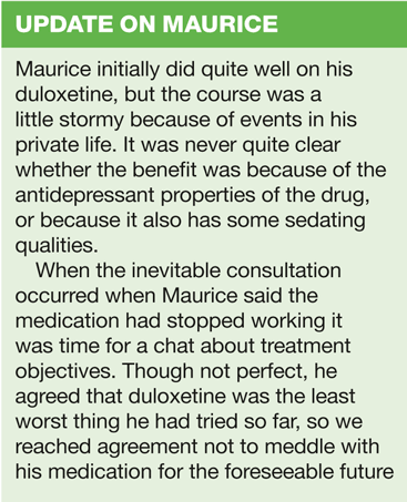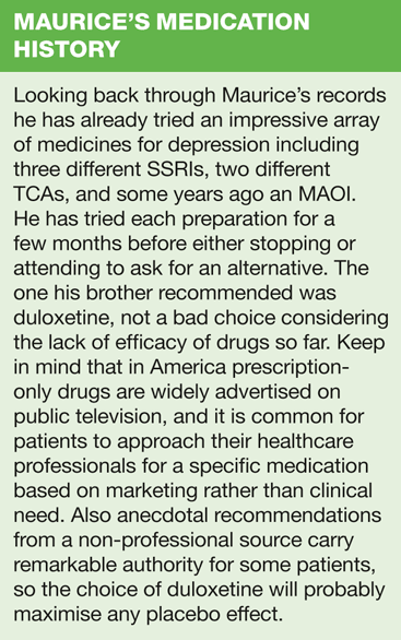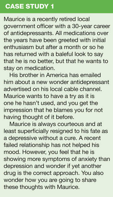 For some years now this group of drugs has been the bedrock of prescribing for depression, and SSRIs are the first line drug treatment recommended by NICE.2 Examples include fluoxetine, citalopram and sertraline. The drugs work by artificially boosting brain levels of serotonin, one of the mood neurotransmitters. An SSRI will help in up to two thirds of patients with depression,5 but bear in mind that a placebo effect of up to 30% is found in controlled trials.6 Up to half of patients will not take the medication as prescribed.7 The commonest side effects are gastrointestinal - nausea, vomiting, dyspepsia, abdominal pain, changed bowel action - and tend to be dose-related. Other troublesome side effects are dry mouth, nervousness, sweats and hallucinations. However, side effects are uncommon, and when a patient finds a side effect intolerable it is worth discussing whether they really want to take tablets at all.