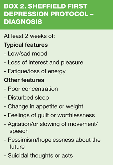 In recurrent depression, making the diagnosis is often not a problem - this is an action replay of previous events. If this is a first episode, the diagnosis can be made with reference to one of the sets of diagnostic criteria that are available. My local health authority publishes a usefully brief list of symptoms to look for - see box 2.