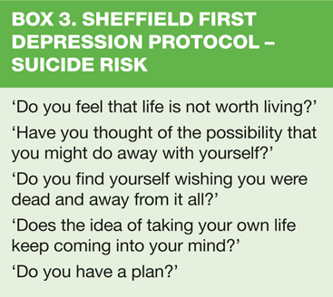A major complication of depression is suicide. Assessment of suicidal risk should figure in all first assessments of depression, and in all early subsequent assessments until the risk has abated. There are some useful questions to ask. (Box 3) Asking the questions does not make suicide any more likely11 - a potentially suicidal patient will have thought of all these things long before coming to see you.