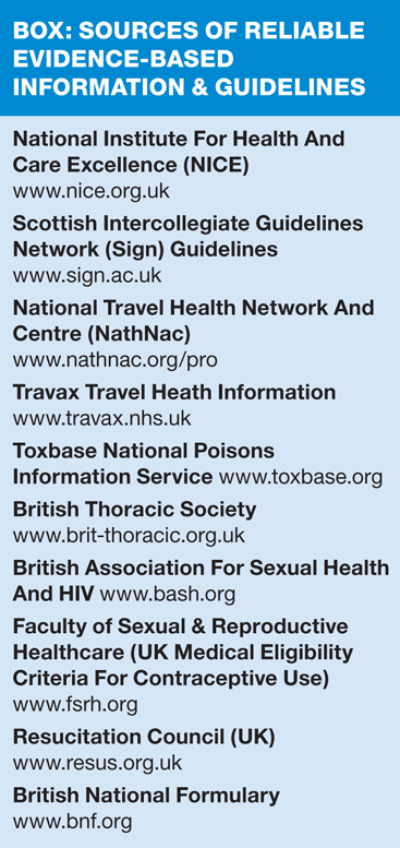 Throughout our daily work, we constantly look to the evidence that is available. There is a wealth of evidence-based national resources, and guidance is easily accessible, at the click of a mouse, and used in our everyday practice (see Box). The web pages of such resources are very open and transparent in detailing the evidence that underpins their guidance, the rigorous processes that are undertaken to validate the evidence and the partnerships with expert bodies to support and maintain standards of excellence in their particular field.