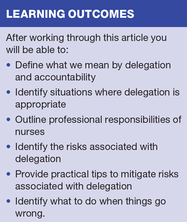 This article outlines the risk management issues relating to delegation and explores nursing responsibilities and accountability.