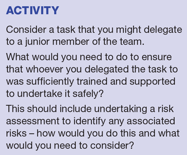 Delegation in nursing has been defined as ‘to entrust or assign to another person a responsibility for a task’.3 It is interesting that this definition uses the word ‘entrust’. In practice nursing teams this could translate to both: