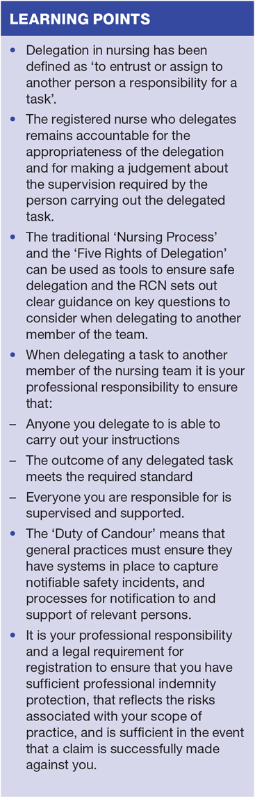 Translating this to general practice means ensuring practice teams have appropriate systems and processes in place to safeguard the delegation of any nursing activities. Some academics promote the use of the traditional nursing process from the early 1970s – assess, plan, implement and evaluate – as a means of ensuring safe delegation.