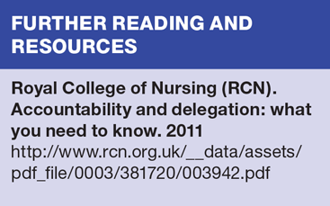 6. Royal College of Nursing. Accountability and delegation: what you need to know, 2011 http://www.rcn.org.uk/__data/assets/pdf_file/0003/381720/003942.pdf